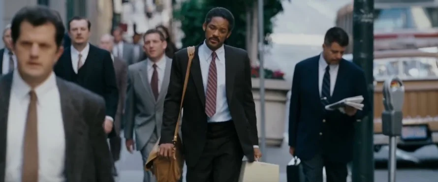 Никто из коллег не догадывается о том, что Крис бездомен. Он каждый день появляется на работе в костюме, моется в раковинах офиса и никому не жалуется на свою участь. Он даже одалживает своему начальнику мистеру Фрому пять долларов на такси — сумму, которую не может себе позволить.