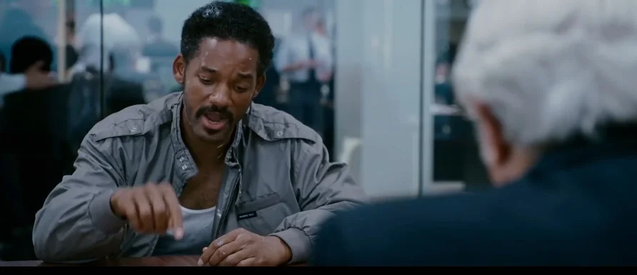 Накануне собеседования Крис вынужден красить квартиру, чтобы отсрочить выселение за неуплату. Полиция арестовывает его за многочисленные неоплаченные штрафы, и он проводит ночь в тюрьме . Наутро он приходит на собеседование прямо из полицейского участка — в одежде, испачканной краской. Несмотря на внешний вид, он производит впечатление на интервьюеров своей искренностью и чувством юмора и получает место стажёра.
