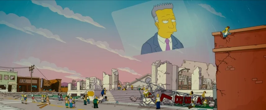 Масштаб катастрофы становится очевиден, когда бурундук, прыгнувший в озеро, превращается в мутировавшего монстра с тысячей глаз. Агентство по охране окружающей среды во главе с Рассом Каргиллом (озвучка Альберта Брукса) докладывает президенту США, которым в этом мире является Арнольд Шварценеггер, о кризисе. Шварценеггер, не вникая, наугад тыкает в третье из пяти предложенных решений, и Спрингфилд накрывают гигантским стеклянным куполом, отрезая от внешнего мира.